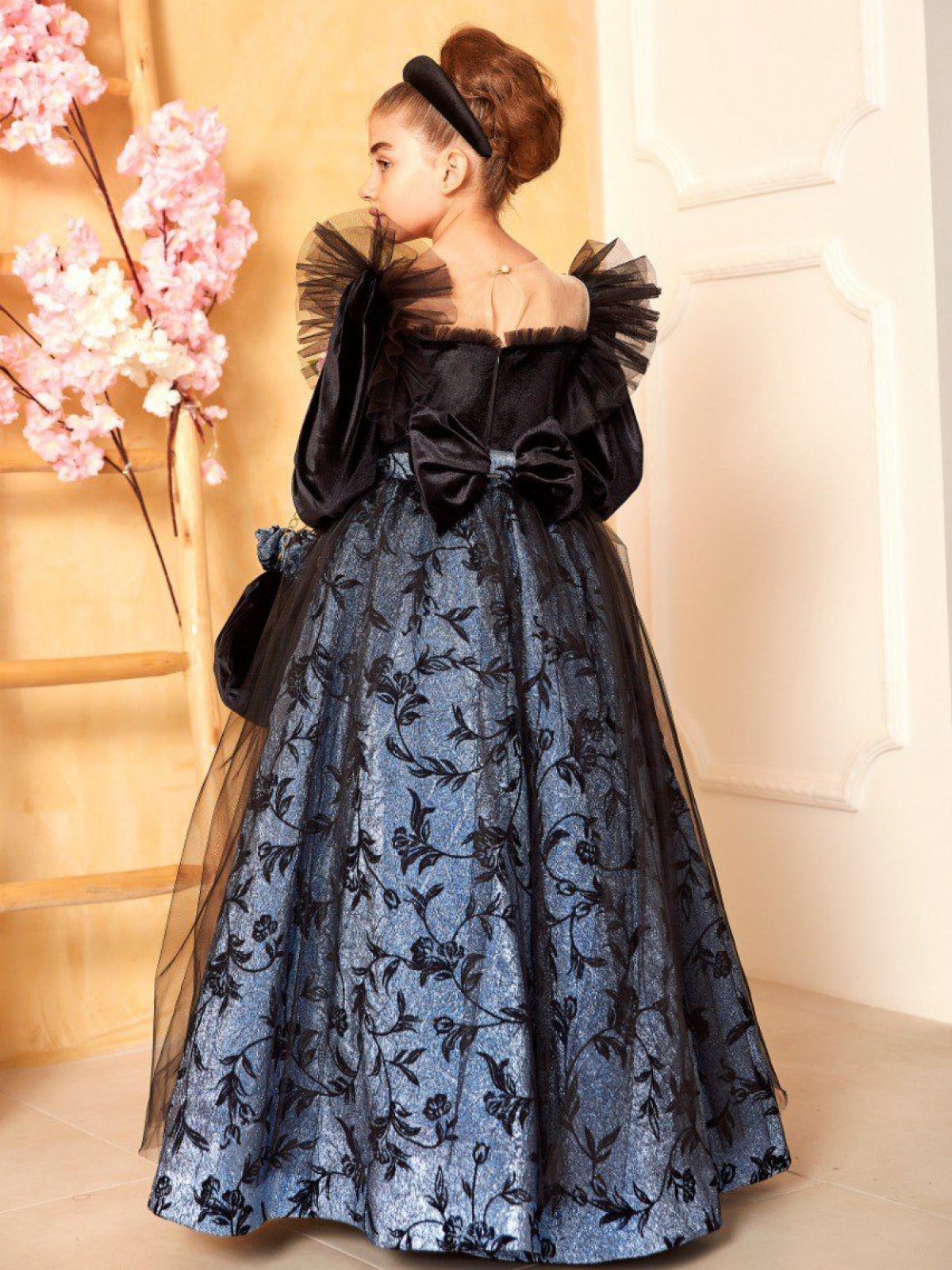 Simli Mavi Kadife Uzun Elbise Uzun Kollu Çanta ve Saç Aksesuarı Dahil