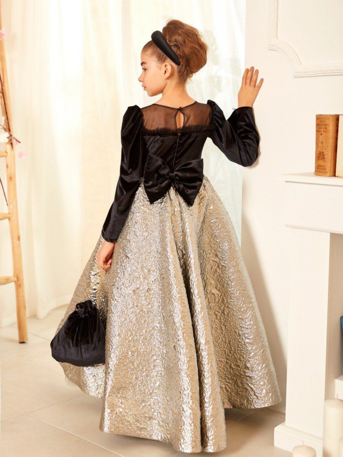 Gümüş Kadife Uzun Elbise Uzun Kollu Çanta ve Saç Aksesuarı Dahil