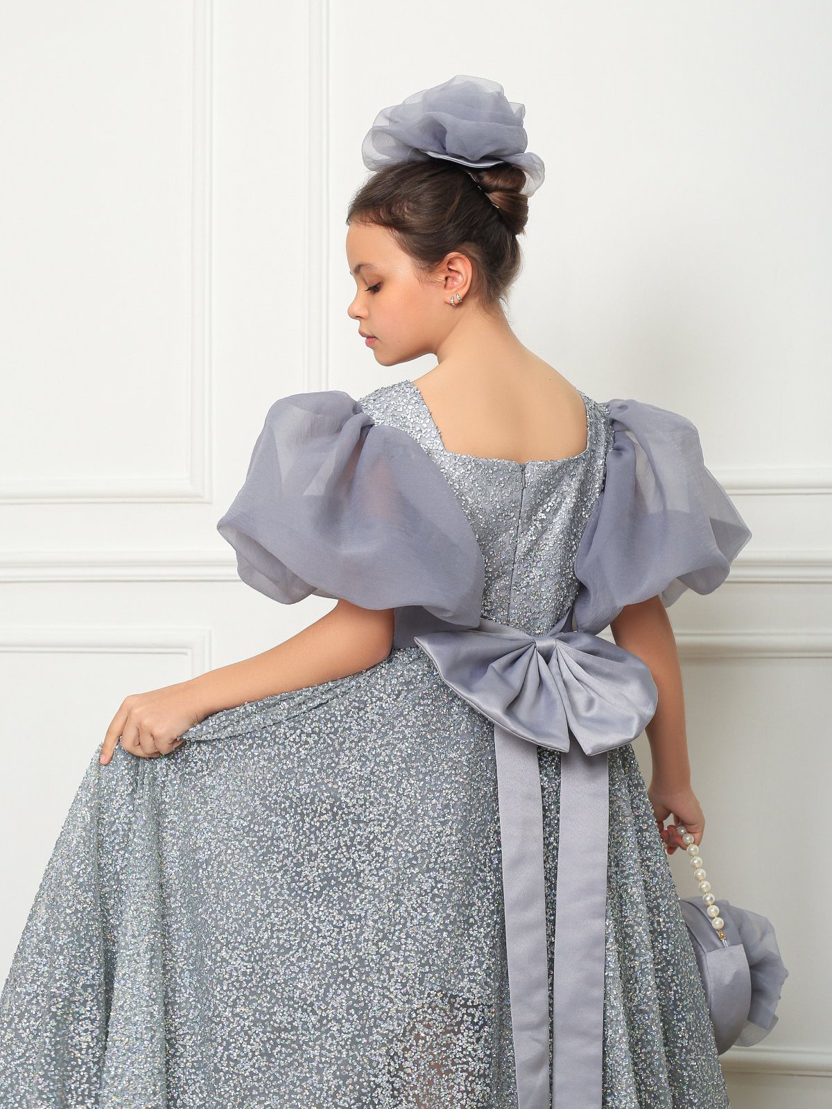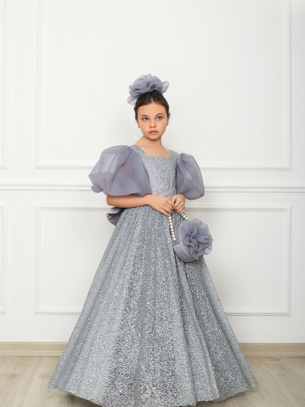 Özel Şık Tasarım Uzun Gümüş Elbise Çanta ve Saç Aksesuar Dahil
