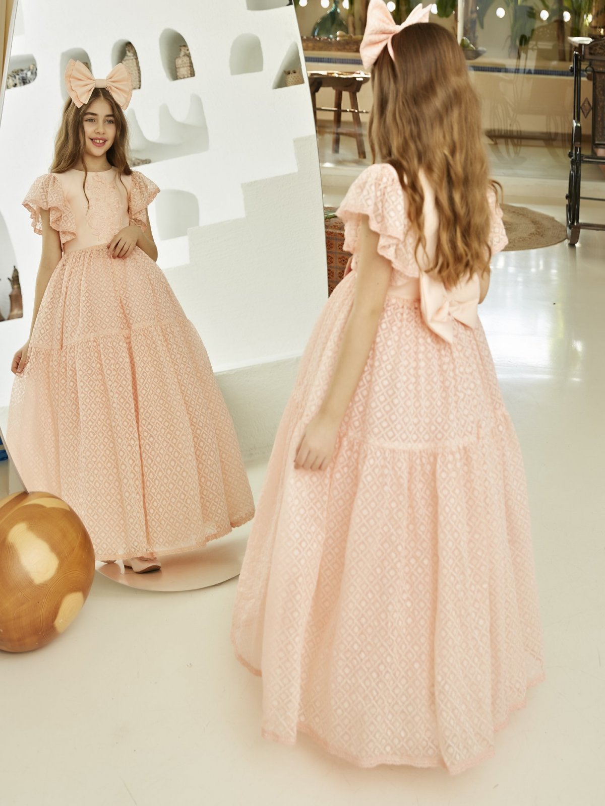 Kız Çocuk Pembe Uzun Kordone Dantel Abiye Elbise Aksesuar Dahil