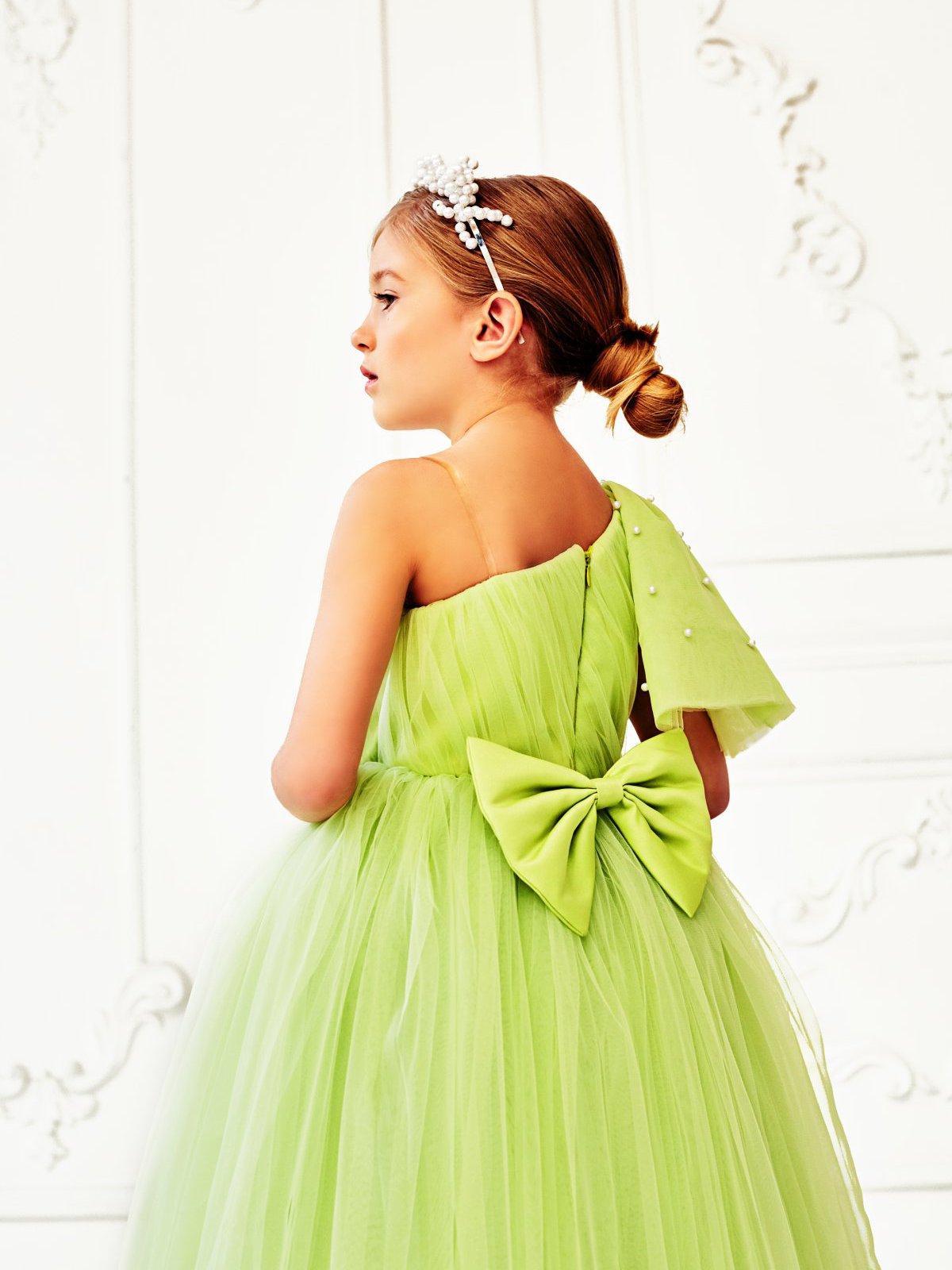Kız Çocuk Sarı Uzun Tasarım Abiye Elbise İnci Aksesuarlı Taç Dahil
