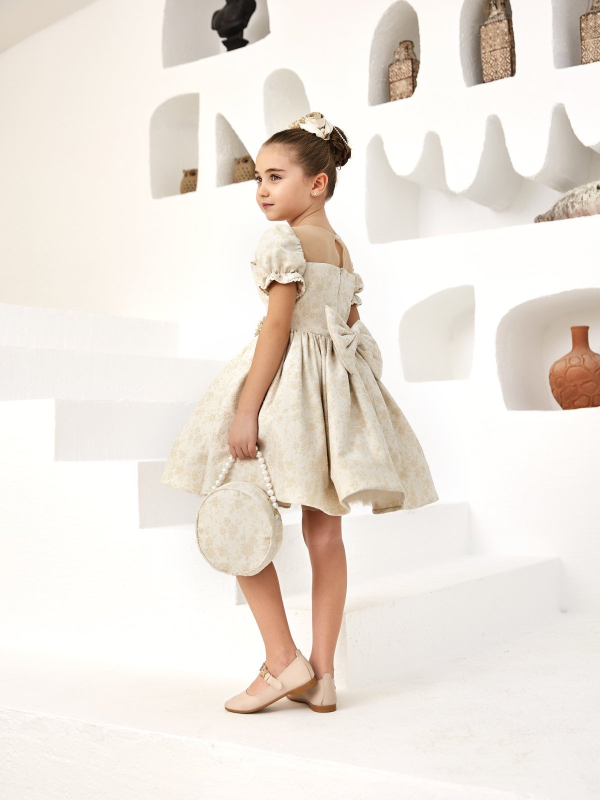 Kız Çocuk Bej Kısa Kabarık Jakarlı Abiye Elbise Çanta Ve Aksesuar Dahil