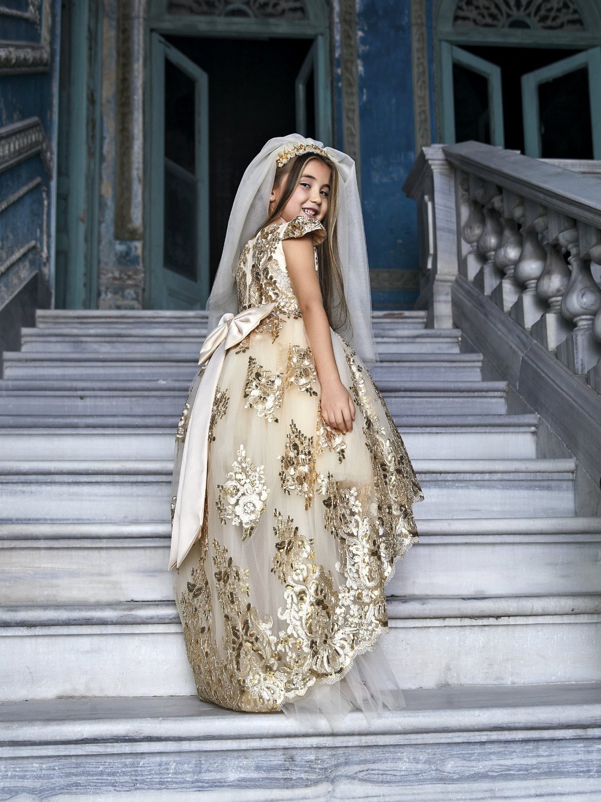 Kız Çocuk Bej Kuyruklu Tasarım Abiye Elbise Aksesuarlı Taç Dahil