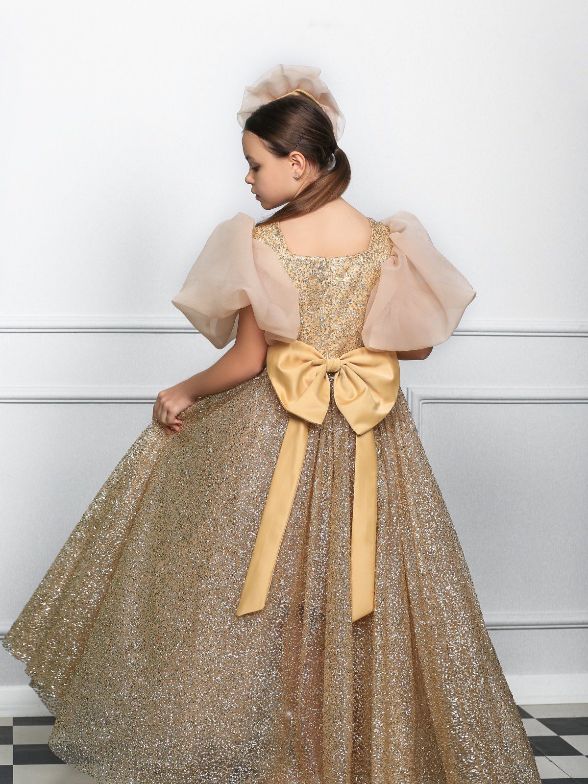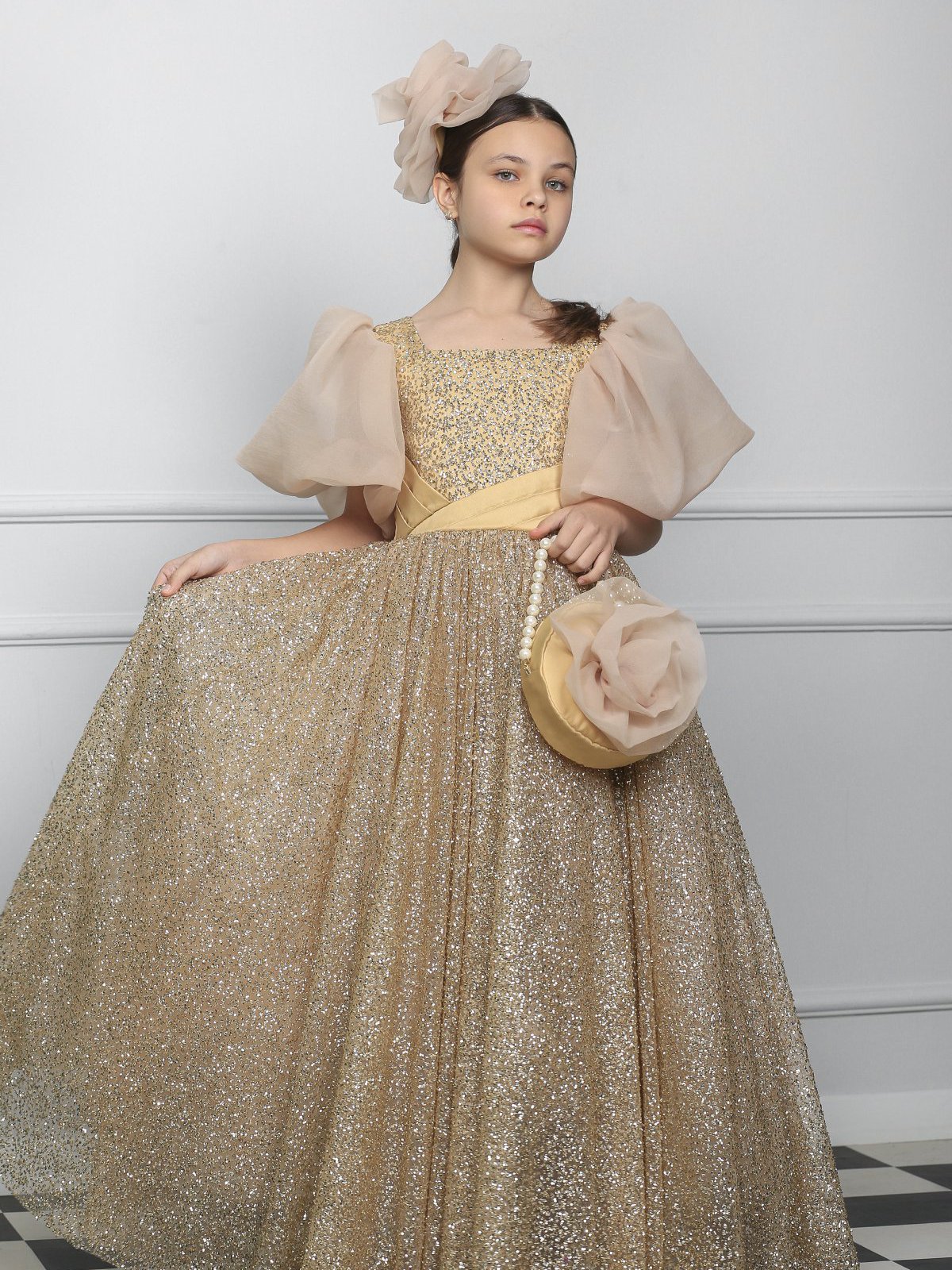 Özel Şık Tasarım Uzun Gold Elbise Çanta ve Saç Aksesuar Dahil