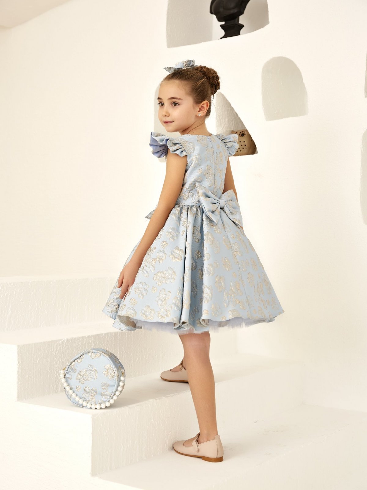 Kız Çocuk Mavi Kısa Kabarık Jakarlı Abiye Elbise Çanta Ve Aksesuar Dahil