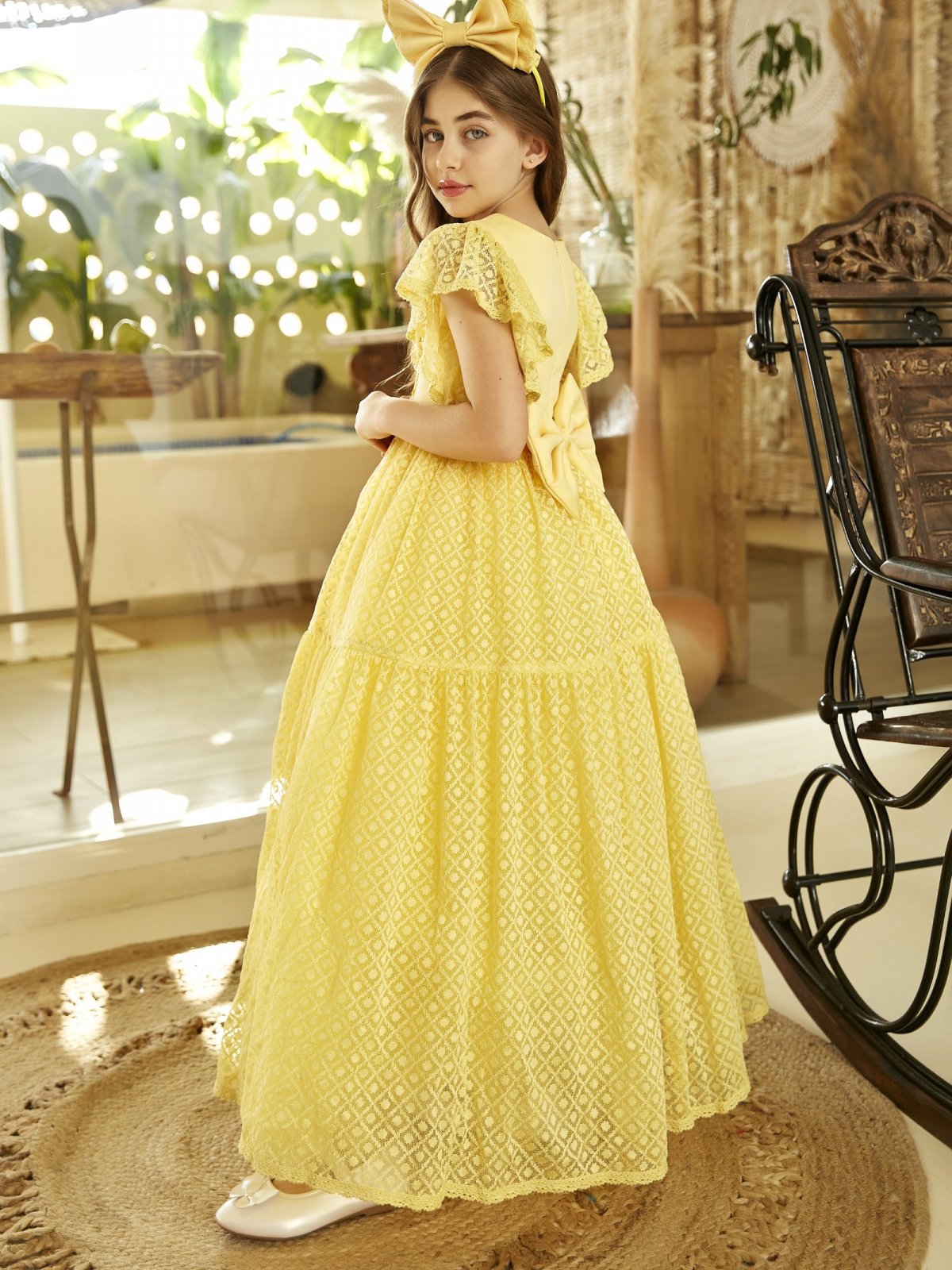 Kız Çocuk Sarı Uzun Kordone Dantel Abiye Elbise Aksesuar Dahil